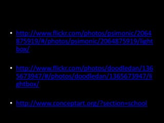 - 64. http://www.flickr.com/photos/psimonic/2064875919/#/photos/psimonic/2064875919/lightbox/<br />http://www.flickr.com/photos/doodledan/1365673947/#/photos/doodledan/1365673947/lightbox/<br />http://www.conceptart.org/?section=school<br />